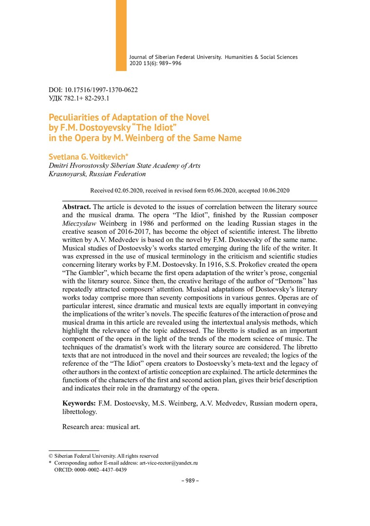 Библиографическое описание:Voitkevich, Svetlana. Peculiarities of Adaptation of the Novel by F.M. Dostoyevsky "The Idiot" in the Opera by M. Weinberg of the Same Name = Особенности прочтения романа Ф. М. Достоевского "Идиот" в одноименной опере М. Вайнберга / S. G. Voitkevich. - Текст : непосредственный // Журнал Сибирского федерального университета. Гуманитарные науки. - 2020. - Т. 13, № 6. - С. 989–996. - Библиогр.: с. 995-996. - ISSN 1997-1370.