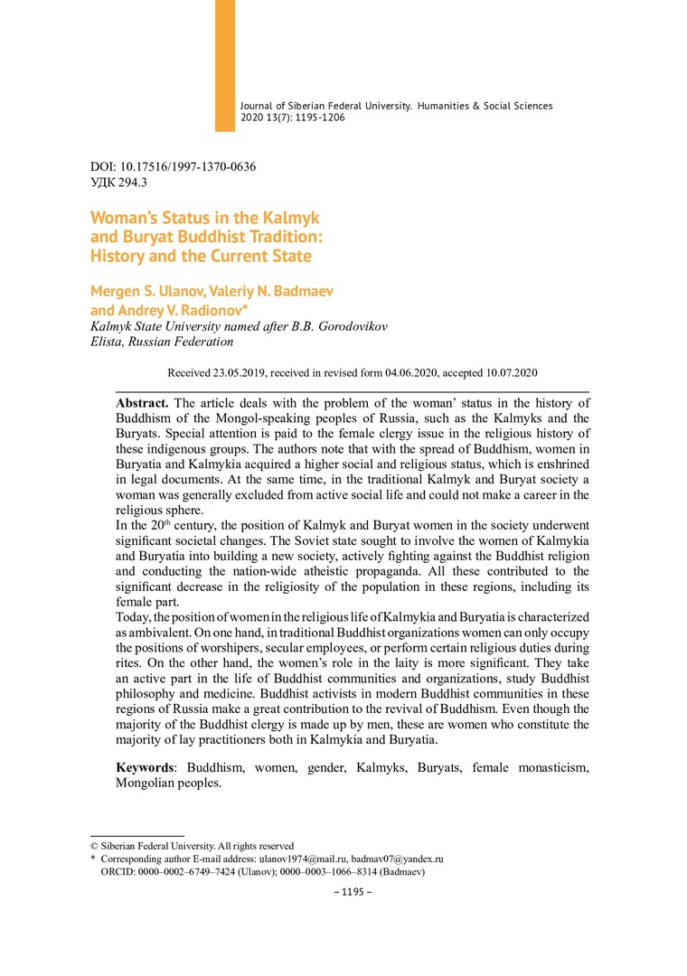 Библиографическое описание:Ulanov, Mergen. Woman`s Status in the Kalmyk and Buryat Buddhist Tradition: History and the Current State = Статус женщины в буддийской традиции калмыков и бурят: история и современное состояние / M. S. Ulanov, V. N. Badmaev, A. V. Radionov. - Текст : непосредственный // Журнал Сибирского федерального университета. Гуманитарные науки. - 2020. - Т. 13, № 7. - С. 1195-1206. - Библиогр.: с. 1203-1206. - ISSN 1997-1370.