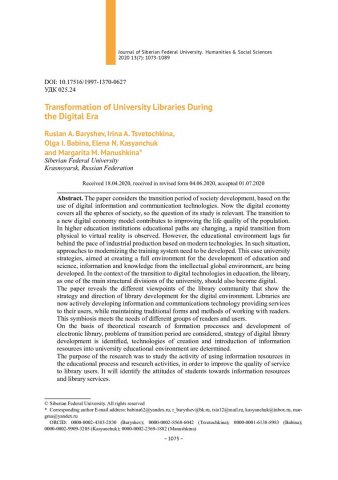 Библиографическое описание:Transformation of University Libraries During the Digital Era = Трансформация университетских библиотек в цифровую эпоху / R. A. Baryshev, I. A. Tsvetochkina, O. I. Babina [и др.]. - Текст : непосредственный // Журнал Сибирского федерального университета. Гуманитарные науки. - 2020. - Т. 13, № 7. - С. 1073-1089. - Библиогр.: с. 1086-1089. - ISSN 1997-1370.