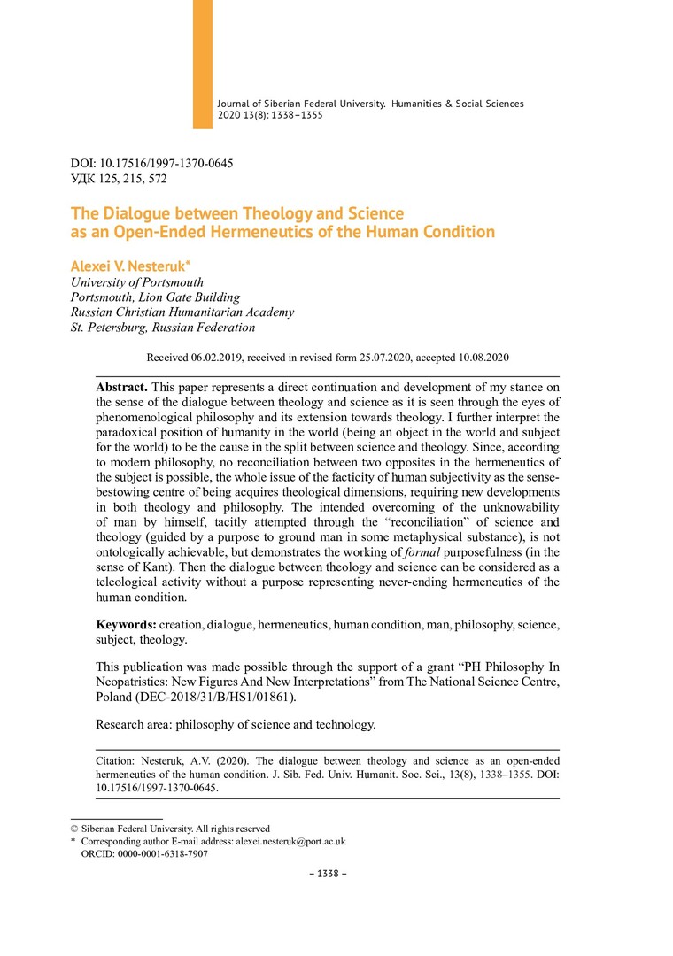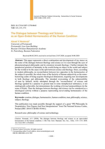 Библиографическое описание:Nesteruk, Alexei. The Dialogue between Theology and Science as an Open-Ended Hermeneutics of the Human Condition = Диалог между богословием и наукой как нескончаемая герменевтика человеческого состояния / A. V. Nesteruk. - Текст : непосредственный // Журнал Сибирского федерального университета. Гуманитарные науки. - 2020. - Т. 13, № 8. - С. 1338–1355. - Библиогр.: с. 1353-1355. - ISSN 1997-1370.