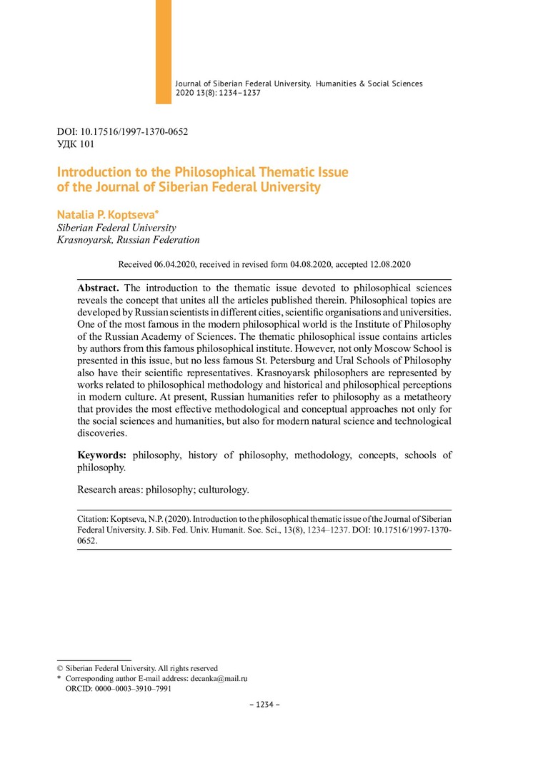 Библиографическое описание:Koptseva, Natalia. Introduction to the Philosophical Thematic Issue of the Journal of Siberian Federal University = Вступительная статья к философскому тематическому выпуску журнала Сибирского федерального университета "Гуманитарные науки" / N. P. Koptseva. - Текст : непосредственный // Журнал Сибирского федерального университета. Гуманитарные науки. - 2020. - Т. 13, № 8. - С. 1234–1237. - Библиогр.: с. 1236-1237. - ISSN 1997-1370.