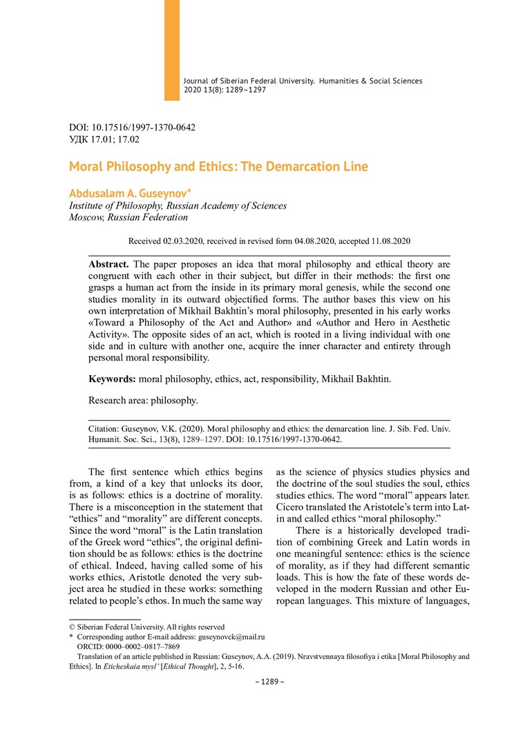 Библиографическое описание:Guseynov, Abdusalam. Moral Philosophy and Ethics: The Demarcation Line = Нравственная философия и этика: линия разграничения / A. A. Guseynov. - Текст : непосредственный // Журнал Сибирского федерального университета. Гуманитарные науки. - 2020. - Т. 13, № 8. - С. 1289–1297. - Библиогр.: с. 1296-1297. - ISSN 1997-1370.