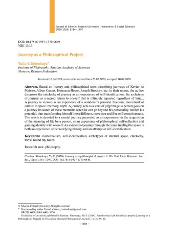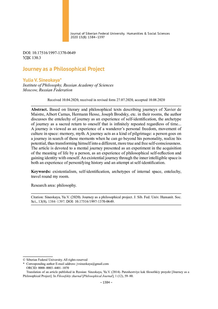 Библиографическое описание:Sineokaya, Yulia. Journey as a Philosophical Project = Путешествие как философский проект / Yu. V. Sineokaya. - Текст : непосредственный // Журнал Сибирского федерального университета. Гуманитарные науки. - 2020. - Т. 13, № 8. - С. 1384–1397. - Библиогр.: с. 1396-1397. - ISSN 1997-1370.