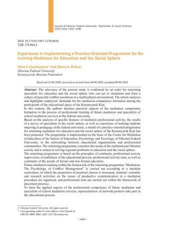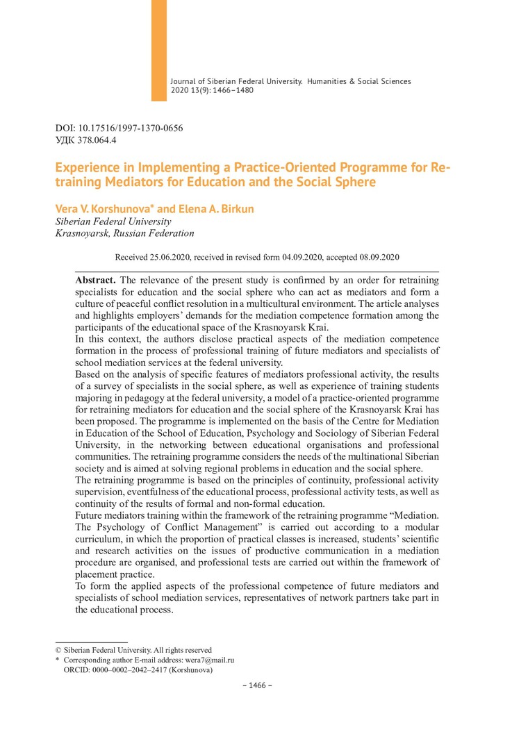 Библиографическое описание:Korshunova, Vera. Experience in Implementing a Practice-Oriented Programme for Retraining Mediators for Education and the Social Sphere = Опыт реализации практико-ориентированной программы переподготовки медиаторов для образования и социальной сферы / V. V. Korshunova, E. A. Birkun. - Текст : непосредственный // Журнал Сибирского федерального университета. Гуманитарные науки. - 2020. - Т. 13, № 9. - С. 1466–1480. - Библиогр.: с. 1477 –1478. - ISSN 1997-1370.