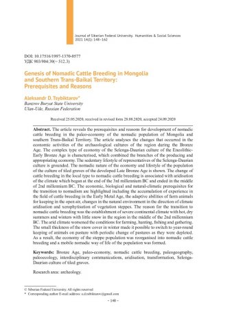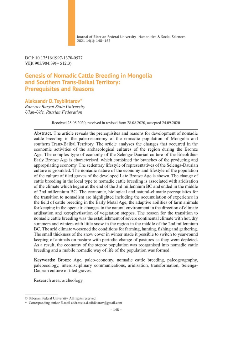 Библиографическое описание:Tsybiktarov, Aleksandr. Genesis of Nomadic Cattle Breeding in Mongolia and Southern Trans-Baikal Territory: Prerequisites and Reasons = Генезис кочевого скотоводства в Монголии и Южном Забайкалье: предпосылки и причины / A. D. Tsybiktarov. - Текст : непосредственный // Журнал Сибирского федерального университета. Гуманитарные науки. - 2021. - Т. 14, № 1. - С. 148-162. - Библиогр.: с. 158. - ISSN 1997-1370.