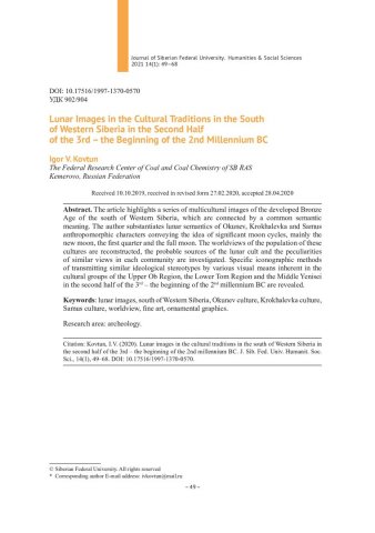 Библиографическое описание:Kovtun, Igor. Lunar Images in the Cultural Traditions in the South of Western Siberia in the Second Half of the 3rd – the Beginning of the 2nd Millennium BC = Лунарные образы в культурных традициях юга Западной Сибири во второй половине III – начале II тыс. до н. э. / I. V. Kovtun. - Текст : непосредственный // Журнал Сибирского федерального университета. Гуманитарные науки. - 2021. - Т. 14, № 1. - С. 49-68. - Библиогр.: с. 65-68. - ISSN 1997-1370.