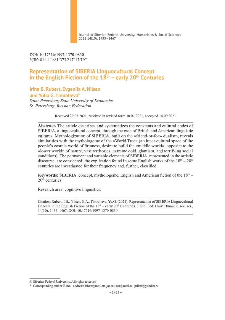 Библиографическое описание:Rubert, Irina. Representation of SIBERIA Linguocultural Concept in the English Fiction of the 18th – early 20th Centuries = Отражение лингвокультурного концепта SIBERIA в англоязычных художественных произведениях XVIII – начала XX века / I. B. Rubert, E. A. Nilsen, Y. G. Timralieva. - Текст : непосредственный // Журнал Сибирского федерального университета. Гуманитарные науки. - 2021. - Т. 14, № 10. - С. 1455-1467. - Библиогр.: с. 1465-1467. - ISSN 1997-1370.