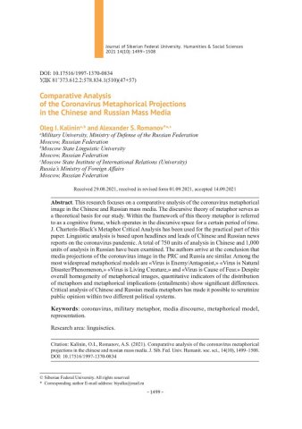 Библиографическое описание:Kalinin, Oleg. Comparative Analysis of the Coronavirus Metaphorical Projections in the Chinese and Russian Mass Media = Сопоставительный анализ метафорических проекций коронавируса в медийных пространствах Китая и России / O. I. Kalinin, A. S. Romanov. - Текст : непосредственный // Журнал Сибирского федерального университета. Гуманитарные науки. - 2021. - Т. 14, № 10. - С. 1499-1508. - Библиогр.: с. 1507-1508. - ISSN 1997-1370.