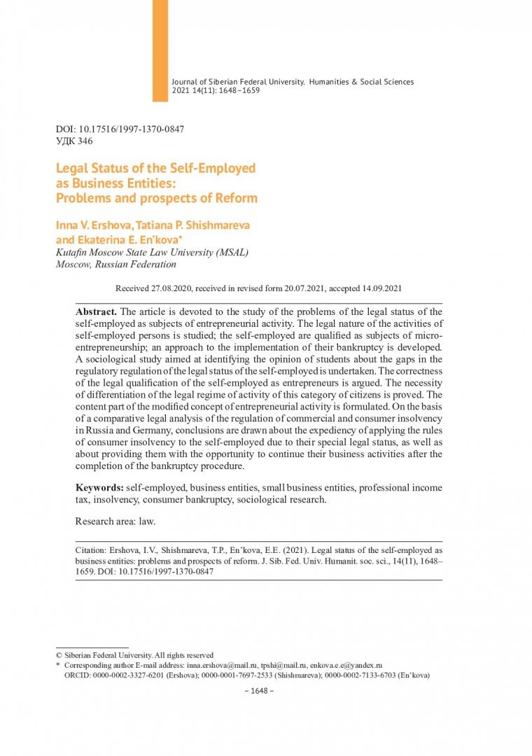 Библиографическое описание:Ершова, Инна. Правовой статус самозанятых как субъектов предпринимательства: проблемы и перспективы реформирования = Legal Status of the Self-Employed as Business Entities: Problems and prospects of Reform / И. В. Ершова, Т. П. Шишмарева, Е. Е. Енькова. - Текст : непосредственный // Журнал Сибирского федерального университета. Гуманитарные науки. - 2021. - Т. 14, № 11. - С. 1648-1659. - Библиогр.: с. 1658-1659. - ISSN 1997-1370.