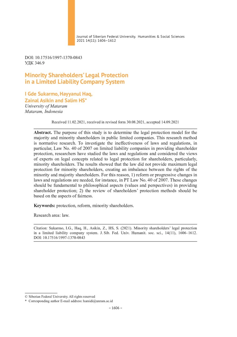 Библиографическое описание:Minority Shareholders` Legal Protection in a Limited Liability Company System = Юридическая защита миноритарных акционеров в системе обществ с ограниченной ответственностью / I Gde Sukarmo, Hayyanul Haq, Zainal Asikin, Salim HS. - Текст : непосредственный // Журнал Сибирского федерального университета. Гуманитарные науки. - 2021. - Т. 14, № 11. - С. 1606-1612. - Библиогр.: с. 1611-1612. - ISSN 1997-1370.