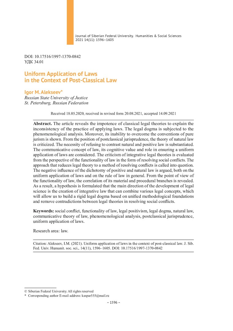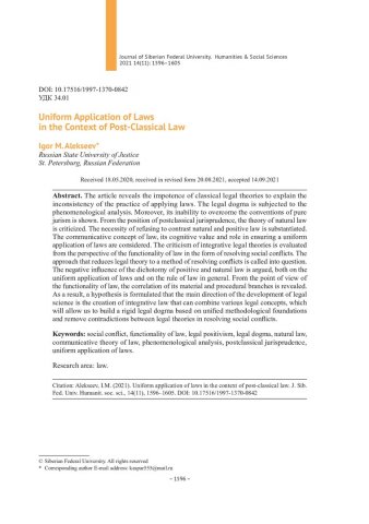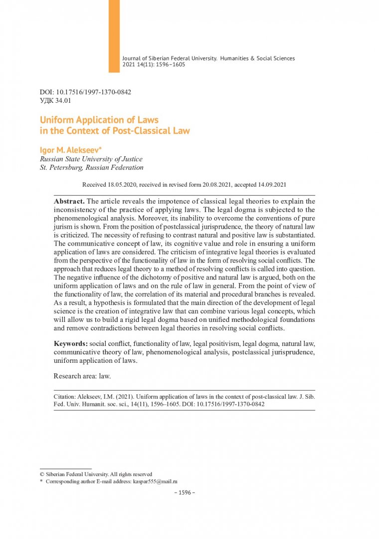 Библиографическое описание:Алексеев, И. М. Единообразное применение законов в контексте постклассического правоведения = Uniform Application of Laws in the Context of Post-Classical Law / И. М. Алексеев. - Текст : непосредственный // Журнал Сибирского федерального университета. Гуманитарные науки. - 2021. - Т. 14, № 11. - С. 1596-1605. - Библиогр.: с. 1604-1605. - ISSN 1997-1370.