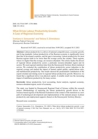 Библиографическое описание:Samusenko, Svetlana. What Drives Labour Productivity Growth: A Case of Regional Economy = Факторы роста производительности труда: пример региональной экономики / S. A. Samusenko, T. S. Zimniakova. - Текст : непосредственный // Журнал Сибирского федерального университета. Гуманитарные науки. - 2021. - Т. 14, № 12. - С. 1873-1884. - Библиогр.: с. 1883-1884. - ISSN 1997-1370.