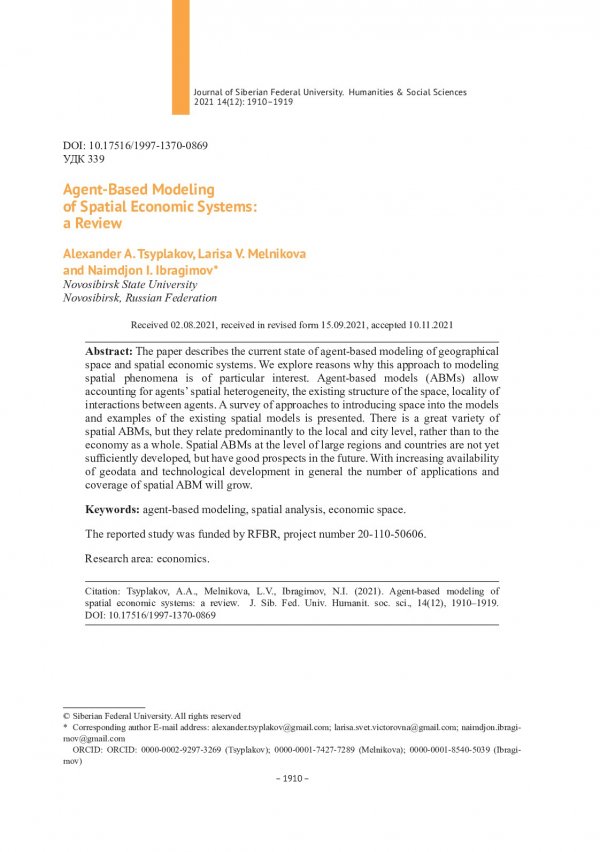 Библиографическое описание:Tsyplakov, Alexander. Agent-Based Modeling of Spatial Economic Systems: а Review = Агент-ориентированное моделирование пространственных экономических систем: обзор / A. A. Tsyplakov, L. V. Melnikova, N. I. Ibragimov. - Текст : непосредственный // Журнал Сибирского федерального университета. Гуманитарные науки. - 2021. - Т. 14, № 12. - С. 1910-1919. - Библиогр.: с. 1917-1919. - ISSN 1997-1370.