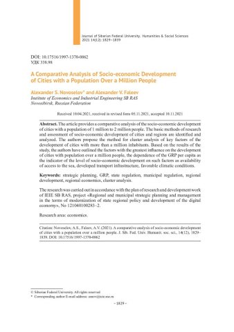 Библиографическое описание:Новоселов, А. С. Сравнительный анализ социально-экономического развития городов-миллионников = A Comparative Analysis of Socio-economic Development of Cities with a Population Over a Million People / А. С. Новоселов, А. В. Фалеев. - Текст : непосредственный // Журнал Сибирского федерального университета. Гуманитарные науки. - 2021. - Т. 14, № 12. - С. 1829-1839. - Библиогр.: с. 1838-1839. - ISSN 1997-1370.