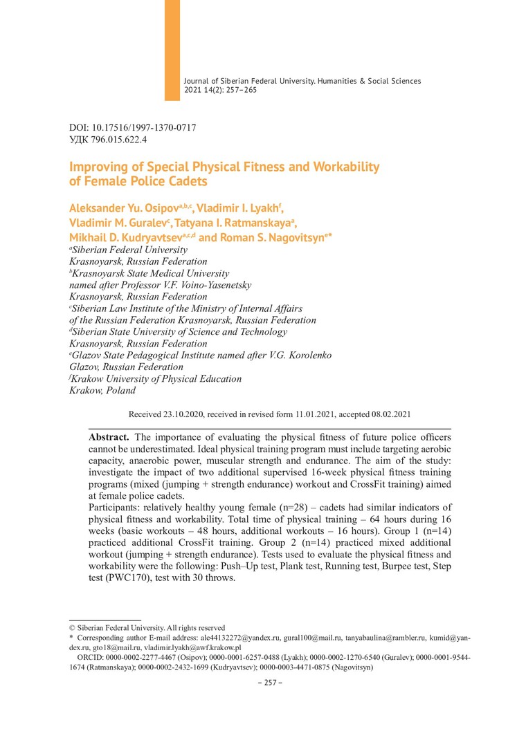 Библиографическое описание:Improving of Special Physical Fitness and Workability of Female Police Cadets = Повышение специальной физической подготовленности и работоспособности женщин-курсантов полиции / A. Yu. Osipov, V. I. Lyakh, V. M. Guralev [и др.]. - Текст : непосредственный // Журнал Сибирского федерального университета. Гуманитарные науки. - 2021. - Т. 14, № 2. - С. 257-265. - Библиогр.: с. 264-265. - ISSN 1997-1370.