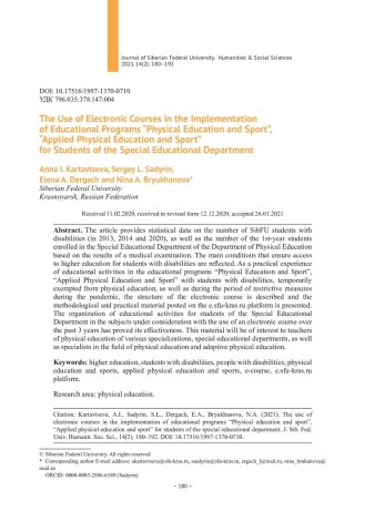 Библиографическое описание:Использование электронных курсов при реализации образовательных программ "Физическая культура и спорт", "Прикладная физическая культура и спорт" для студентов специального учебного отделения = The Use of Electronic Courses in the Implementation of Educational Programs "Physical Education and Sport", "Applied Physical Education and Sport" / А. И. Картавцева, С. Л. Садырин, Е. А. Дергач, Н. А. Брюханова. - Текст : непосредственный // Журнал Сибирского федерального университета. Гуманитарные науки. - 2021. - Т. 14, № 2. - С. 180-192. - Библиогр.: с. 192. - ISSN 1997-1370.
