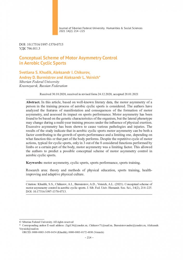Библиографическое описание:Концептуальная схема управления моторной асимметрией в циклических видах спорта аэробной направленности = Conceptual Scheme of Motor Asymmetry Control in Aerobic Cyclic Sports / С. С. Худик, А. И. Чикуров, А. Д. Бурмистров, А. Л. Войнич. - Текст : непосредственный // Журнал Сибирского федерального университета. Гуманитарные науки. - 2021. - Т. 14, № 2. - С. 214-225. - Библиогр.: с. 220-225. - ISSN 1997-1370.