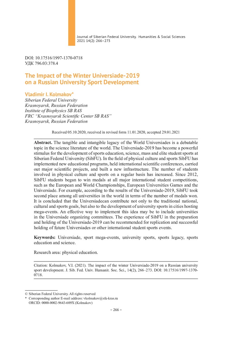 Библиографическое описание:Kolmakov, Vladimir. The Impact of the Winter Universiade-2019 on a Russian University Sport Development = Влияние зимней Универсиады-2019 на развитие спорта в российском университете / V. I. Kolmakov. - Текст : непосредственный // Журнал Сибирского федерального университета. Гуманитарные науки. - 2021. - Т. 14, № 2. - С. 266-273. - Библиогр.: с. 272-273. - ISSN 1997-1370.