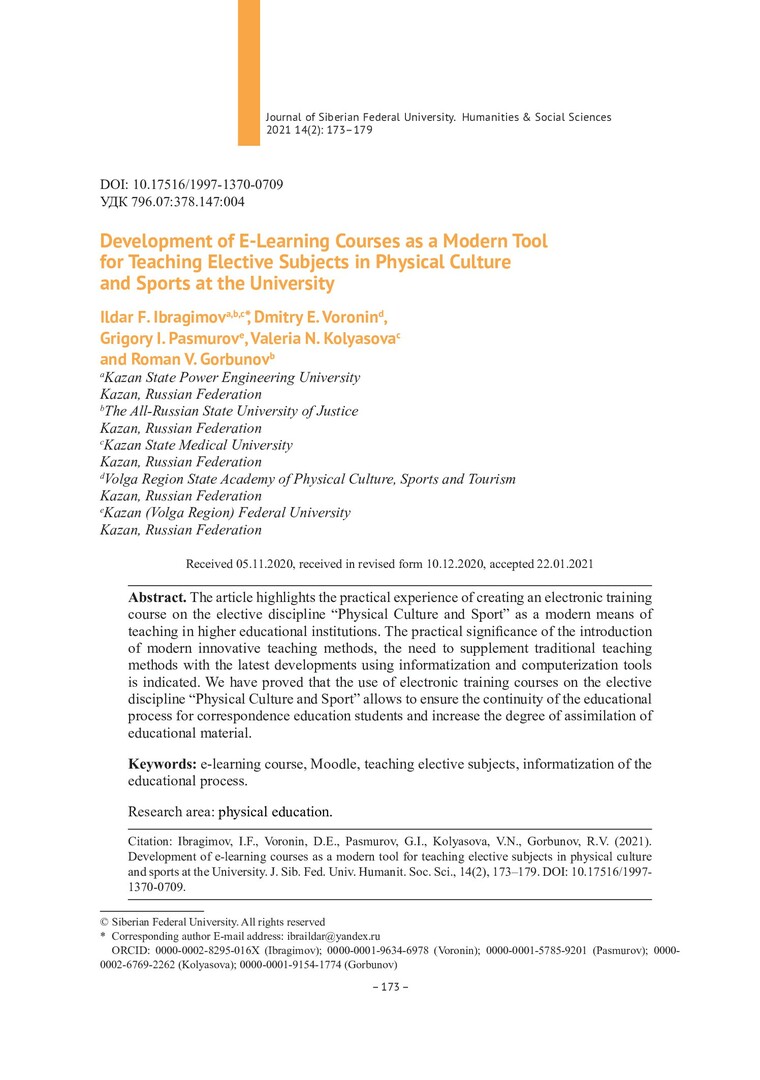Библиографическое описание:Разработка электронных учебных курсов как современного инструмента преподавания элективной дисциплины по физической культуре и спорту в вузе = Development of E-Learning Courses as a Modern Tool for Teaching Elective Subjects in Physical Culture and Sports at the University / И. Ф. Ибрагимов, Д. Е. Воронин, Г. И. Пасмуров [и др.]. - Текст : непосредственный // Журнал Сибирского федерального университета. Гуманитарные науки. - 2021. - Т. 14, № 2. - С. 173-179. - Библиогр.: с. 179. - ISSN 1997-1370.