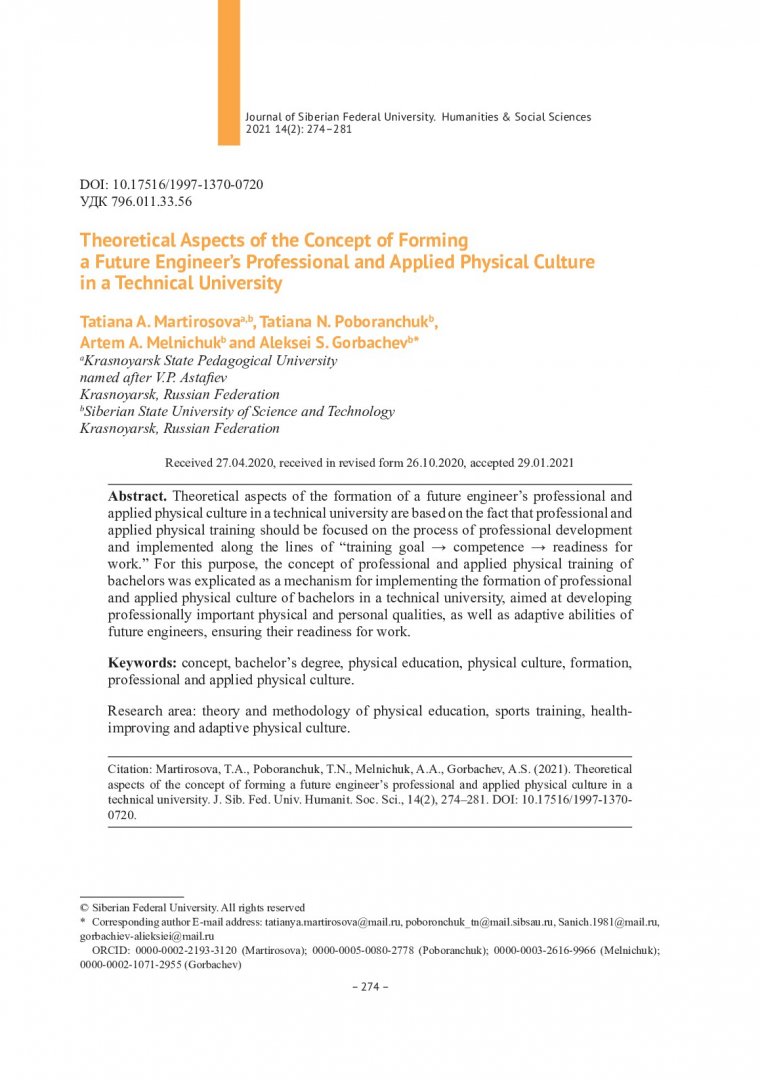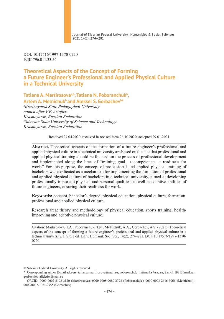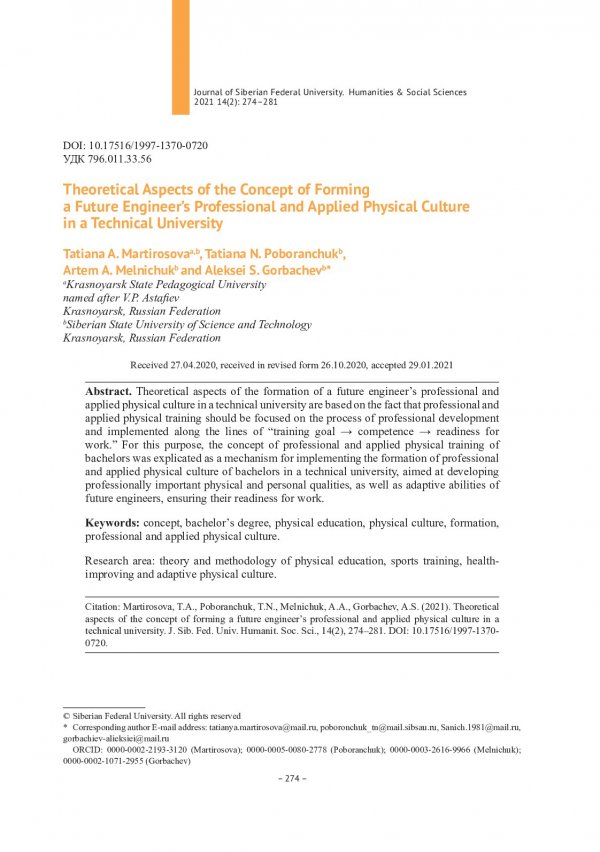 Библиографическое описание:Theoretical Aspects of the Concept of Forming a Future Engineer`s Professional and Applied Physical Culture in a Technical University = Теоретические аспекты концепции формирования профессионально-прикладной физической культуры будущего инженера в техническом вузе / T. A. Martirosova, T. N. Poboranchuk, A. A. Melnichuk, A. S. Gorbachev. - Текст : непосредственный // Журнал Сибирского федерального университета. Гуманитарные науки. - 2021. - Т. 14, № 2. - С. 274-281. - Библиогр.: с. 280-281. - ISSN 1997-1370.