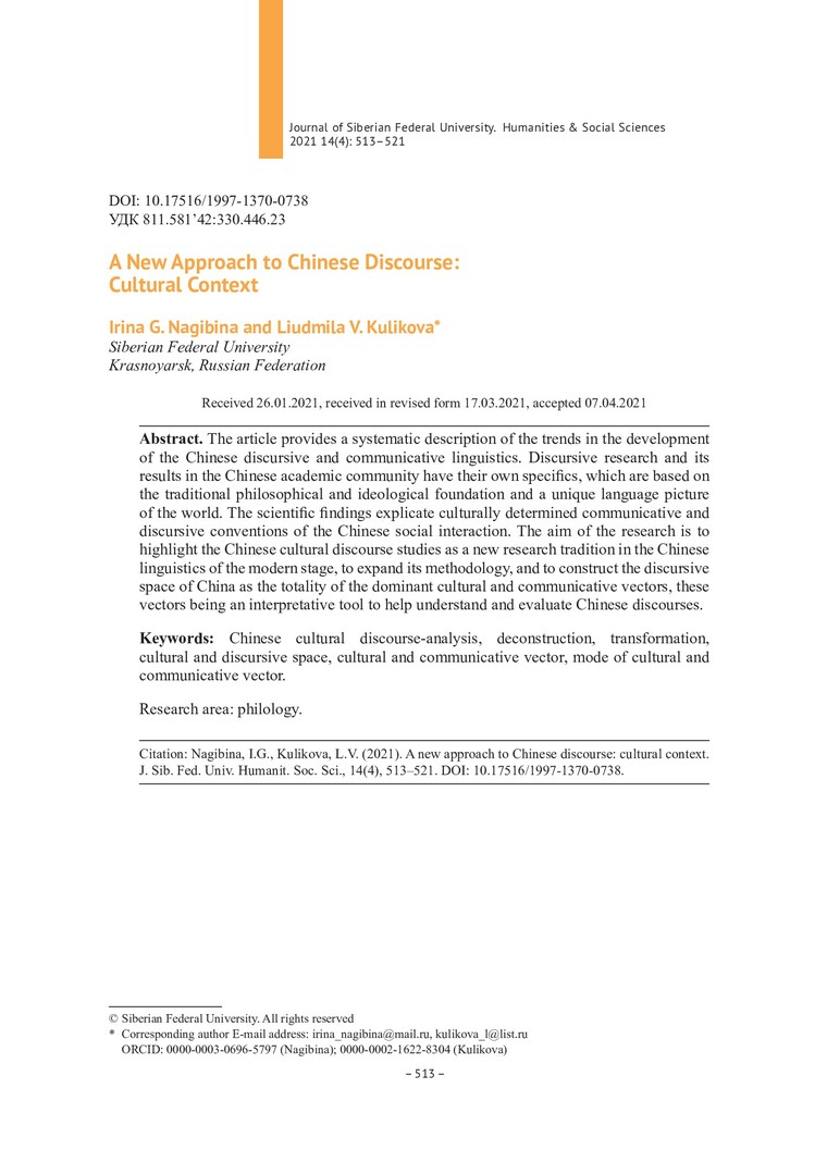 Библиографическое описание:Nagibina, Irina. A New Approach to Chinese Discourse: Cultural Context = Новый подход к исследованию китайского дискурса: культурный контекст / I. G. Nagibina, L. V. Kulikova. - Текст : непосредственный // Журнал Сибирского федерального университета. Гуманитарные науки. - 2021. - Т. 14, № 4. - С. 513-521. - Библиогр.: с. 520-521. - ISSN 1997-1370.