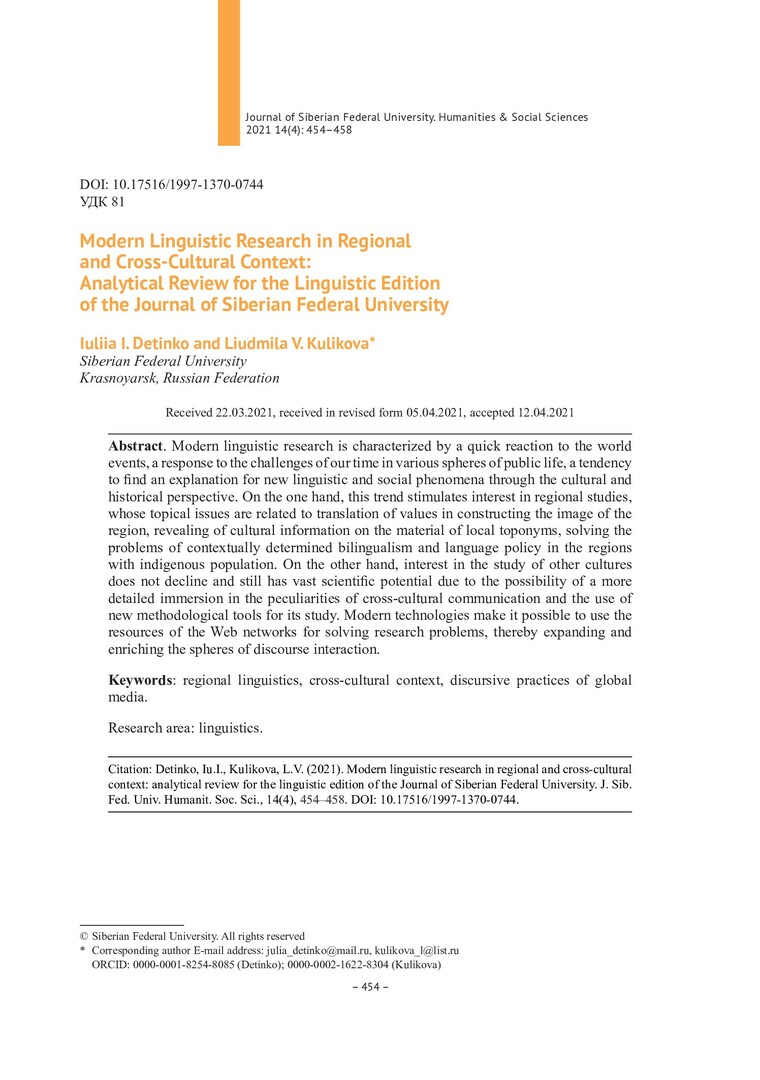 Modern Linguistic Research in Regional and Cross-Cultural Context: Analytical Review for the Linguistic Edition of the Journal of Siberian Federal University