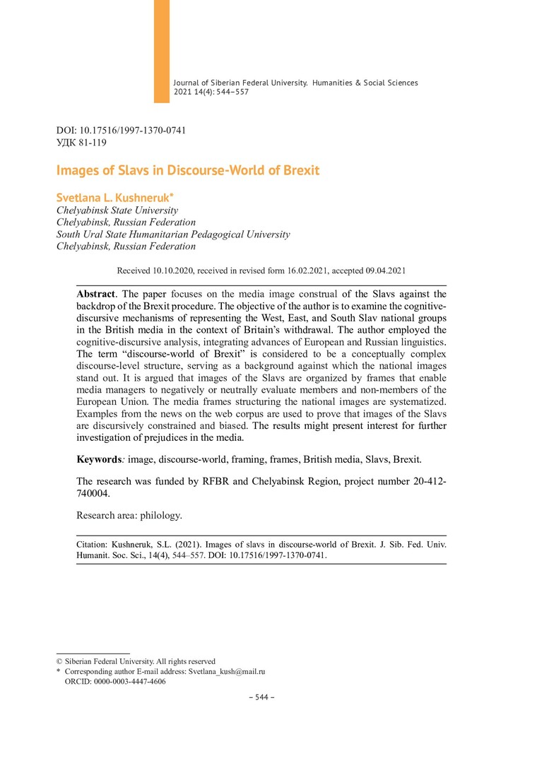 Библиографическое описание:Kushneruk, Svetlana. Images of Slavs in Discourse-World of Brexit = Образы славян в дискурсивном мире Брексита / S. L. Kushneruk. - Текст : непосредственный // Журнал Сибирского федерального университета. Гуманитарные науки. - 2021. - Т. 14, № 4. - С. 544-557. - Библиогр.: с. 555-557. - ISSN 1997-1370.