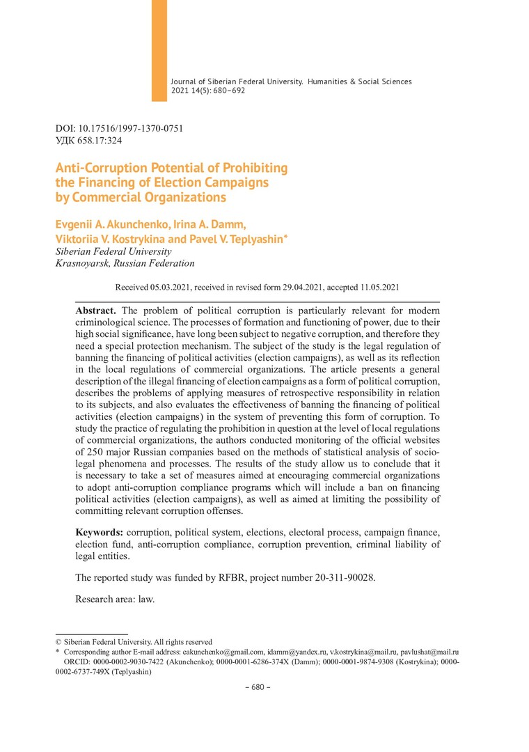 Библиографическое описание:Антикоррупционный потенциал запрета на финансирование избирательных кампаний в деятельности коммерческих организаций = Anti-Corruption Potential of Prohibiting the Financing of Election Campaigns by Commercial Organizations / Е. А. Акунченко, И. А. Дамм, В. В. Кострыкина, П. В. Тепляшин. - Текст : непосредственный // Журнал Сибирского федерального университета. Гуманитарные науки. - 2021. - Т. 14, № 5. - С. 680-692. - Библиогр.: с. 689-692. - ISSN 1997-1370.