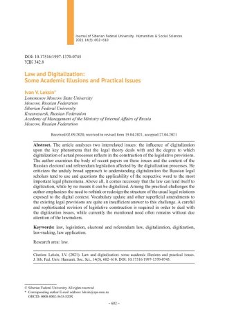 Библиографическое описание:Leksin, Ivan. Law and Digitalization: Some Academic Illusions and Practical Issues = Право и цифровизация: некоторые теоретические иллюзии и практические проблемы / I. V. Leksin. - Текст : непосредственный // Журнал Сибирского федерального университета. Гуманитарные науки. - 2021. - Т. 14, № 5. - С. 602-610. - Библиогр.: с. 608-610. - ISSN 1997-1370.