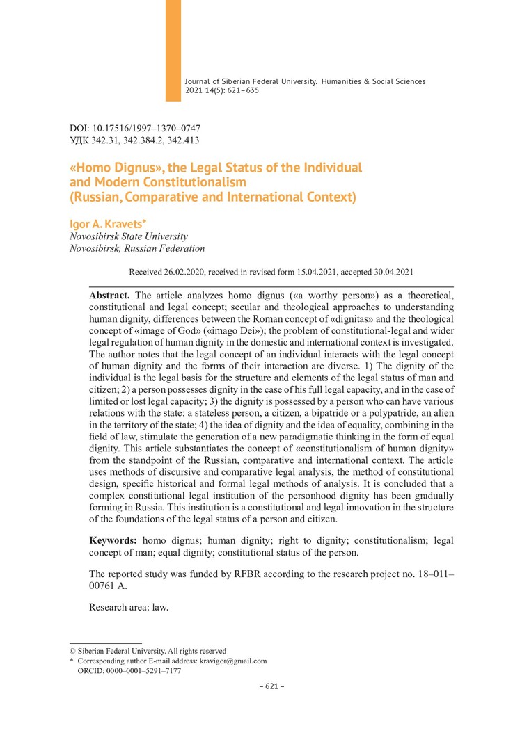 Библиографическое описание:Кравец, Игорь. "Homo dignus", правовое положение личности и современный конституционализм (российский, сравнительный и международный контекст) = "Homo Dignus", the Legal Status of the Individual and Modern Constitutionalism (Russian, Comparative and International Context) / И. А. Кравец. - Текст : непосредственный // Журнал Сибирского федерального университета. Гуманитарные науки. - 2021. - Т. 14, № 5. - С. 621-635. - Библиогр.: с. 634-635. - ISSN 1997-1370.