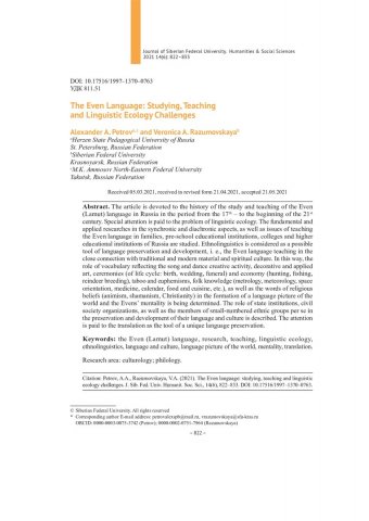 Библиографическое описание:Petrov, Alexander. The Even Language: Studying, Teaching and Linguistic Ecology Challenges = Эвенский язык: исследования, преподавание, вызовы лингвоэкологии / A. A. Petrov, V. A. Razumovskaya. - Текст : непосредственный // Журнал Сибирского федерального университета. Гуманитарные науки. - 2021. - Т. 14, № 6. - С. 822-833. - Библиогр.: с. 832-833. - ISSN 1997-1370.