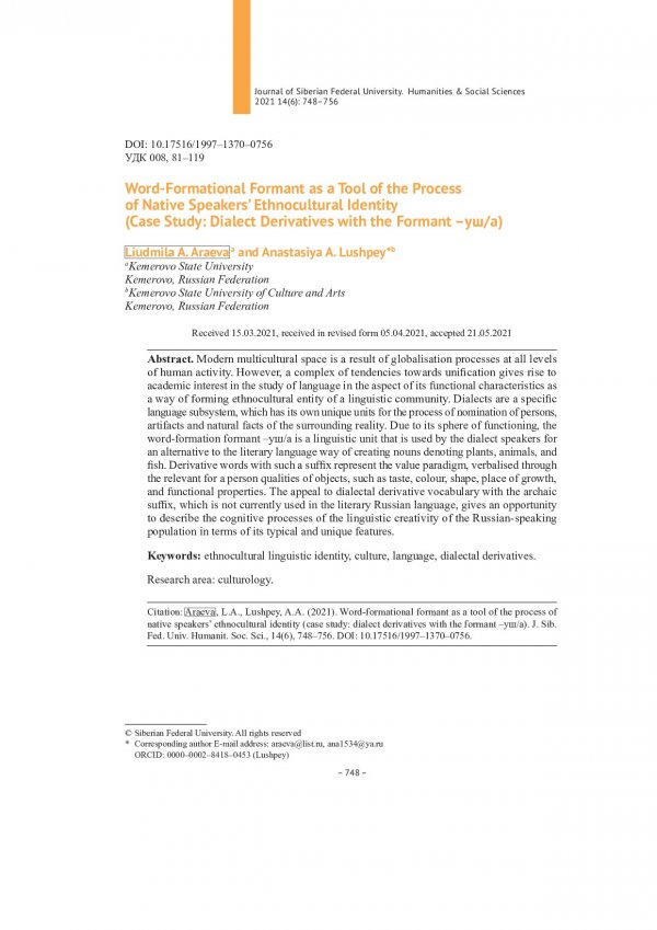Библиографическое описание:Араева, Людмила. Словообразовательный формант как инструмент процесса этнокультурной идентичности носителей языка (на материале диалектных дериватов с формантом –уш/а) = Word-Formational Formant as a Tool of the Process of Native Speakers` Ethnocultural Identity (Case Study: Dialect Derivatives with the Formant –уш/а) / Л. А. Араева, А. А. Лушпей. - Текст : непосредственный // Журнал Сибирского федерального университета. Гуманитарные науки. - 2021. - Т. 14, № 6. - С. 748-756. - Библиогр.: с. 755-756. - ISSN 1997-1370.