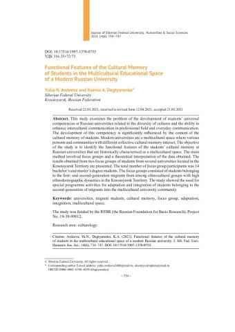 Библиографическое описание:Avdeeva, Yulia. Functional Features of the Cultural Memory of Students in the Multicultural Educational Space of a Modern Russian University = Функциональные особенности культурной памяти студентов в поликультурном образовательном пространстве современного российского вуза / Y. N. Avdeeva, K. A. Degtyarenko. - Текст : непосредственный // Журнал Сибирского федерального университета. Гуманитарные науки. - 2021. - Т. 14, № 6. - С. 734-747. - Библиогр.: с. 745-747. - ISSN 1997-1370.