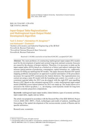 Библиографическое описание:Ershov, Yurii. Input-Output Table Regionalization and Multiregional Input-Output Model Development Algorithm = Алгоритм регионализации таблицы "затраты-выпуск" и построения межрегиональной межотраслевой модели / Y. S. Ershov, N. M. Ibragimov, A. I. Dushenin. - Текст : непосредственный // Журнал Сибирского федерального университета. Гуманитарные науки. - 2021. - Т. 14, № 7. - С. 1018-1027. - Библиогр.: с. 1026-1027. - ISSN 1997-1370.