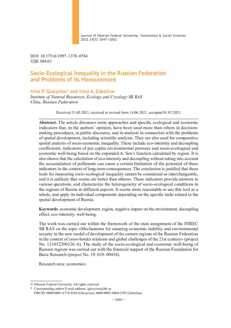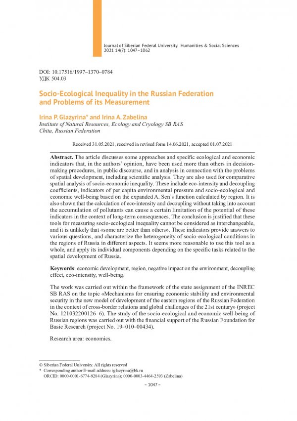 Библиографическое описание:Глазырина, Ирина. Социально-экологическое неравенство в Российской Федерации и проблемы его измерения = Socio-Ecological Inequality in the Russian Federation and Problems of its Measurement / И. П. Глазырина, И. А. Забелина. - Текст : непосредственный // Журнал Сибирского федерального университета. Гуманитарные науки. - 2021. - Т. 14, № 7. - С. 1047-1062. - Библиогр.: с. 1060-1062. - ISSN 1997-1370.