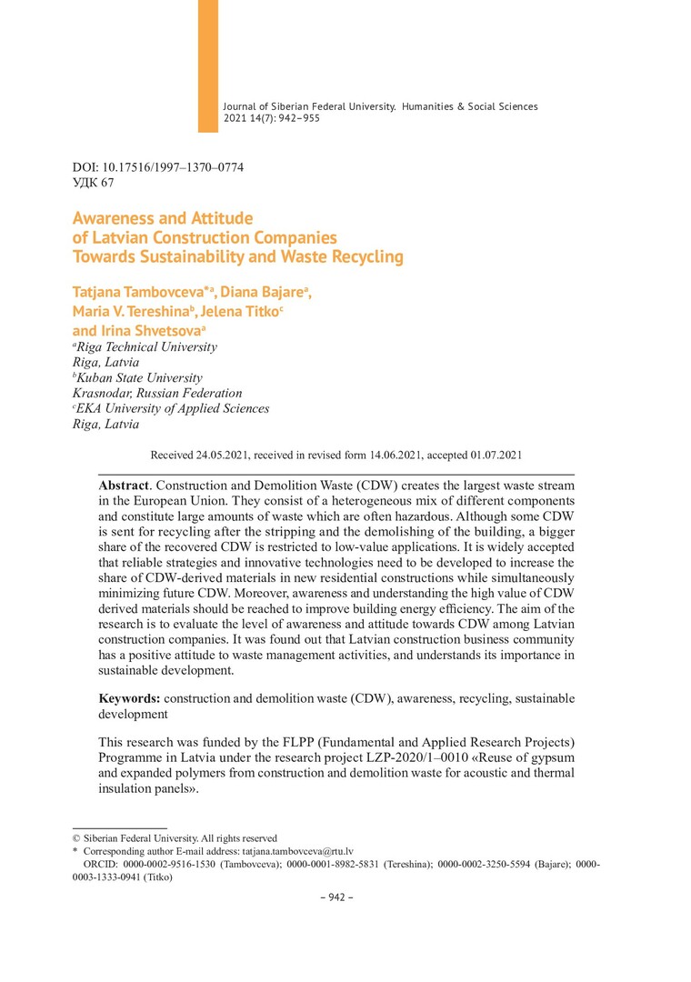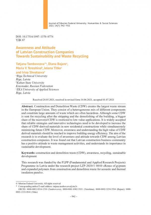 Библиографическое описание:Awareness and Attitude of Latvian Construction Companies Towards Sustainability and Waste Recycling = Осведомленность и отношение латвийских строительных компаний к устойчивому развитию и переработке отходов / Tatjana Tambovceva, Diana Bajare, MariaTereshina [et al.]. - Текст : непосредственный // Журнал Сибирского федерального университета. Гуманитарные науки. - 2021. - Т. 14, № 7. - С. 942-955. - Библиогр.: с. 953-955. - ISSN 1997-1370.