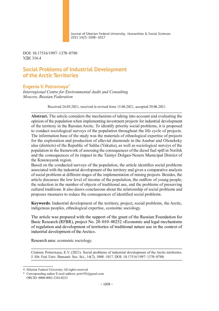 Библиографическое описание:Potravnaya, Evgenia. Social Problems of Industrial Development of the Arctic Territories = Социальные проблемы промышленного освоения арктических территорий / E. V. Potravnaya. - Текст : непосредственный // Журнал Сибирского федерального университета. Гуманитарные науки. - 2021. - Т. 14, № 7. - С. 1008-1017. - Библиогр.: с. 1016-1017. - ISSN 1997-1370.