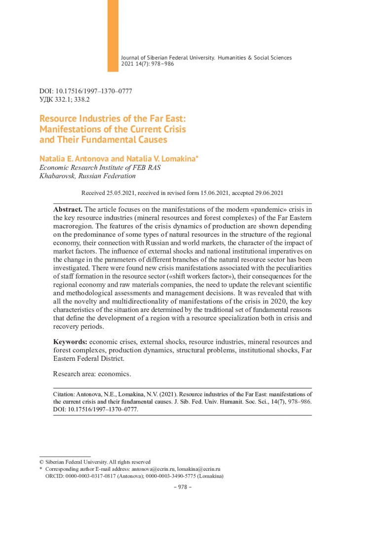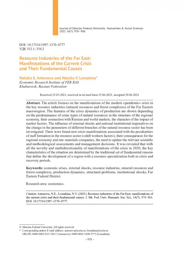 Библиографическое описание:Antonova, Natalia. Resource Industries of the Far East: Manifestations of the Current Crisis and Their Fundamental Causes = Ресурсные отрасли Дальнего Востока: проявления современного кризиса и их фундаментальные причины / N. Е. Antonova, N. V. Lomakina. - Текст : непосредственный // Журнал Сибирского федерального университета. Гуманитарные науки. - 2021. - Т. 14, № 7. - С. 978-986. - Библиогр.: с. 985-986. - ISSN 1997-1370.