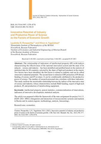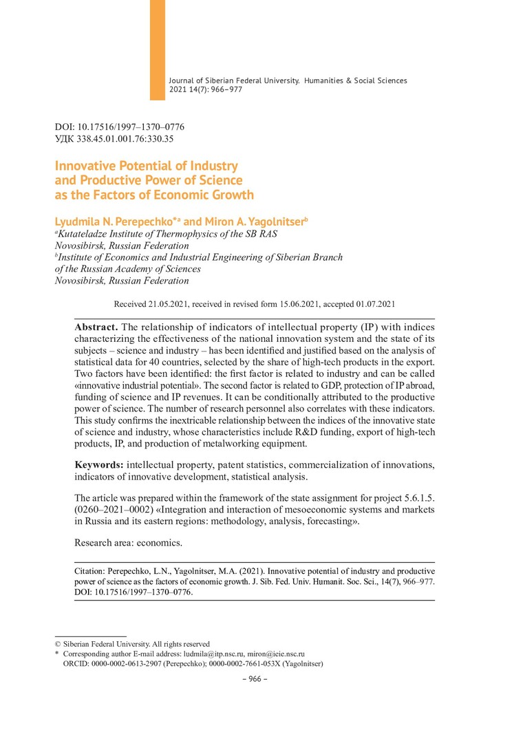 Библиографическое описание:Perepechko, Lyudmila. Innovative Potential of Industry and Productive Power of Science as the Factors of Economic Growth = Инновационный потенциал промышленности и производительная сила науки как факторы экономического роста / L. N. Perepechko, M. A. Yagolnitser. - Текст : непосредственный // Журнал Сибирского федерального университета. Гуманитарные науки. - 2021. - Т. 14, № 7. - С. 966-977. - Библиогр.: с. 976-977. - ISSN 1997-1370.