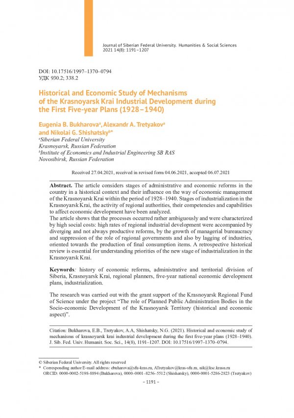 Библиографическое описание:Бухарова, Евгения. Историко-экономическое исследование механизмов промышленного развития Красноярского края в годы первых пятилеток (1928–1940 гг.) = Historical and Economic Study of Mechanisms of the Krasnoyarsk Krai Industrial Development during the First Five-year Plans (1928–1940) / Е. Б. Бухарова, А. А. Третьяков, Н. Г. Шишацкий. - Текст : непосредственный // Журнал Сибирского федерального университета. Гуманитарные науки. - 2021. - Т. 14, № 8. - С. 1191-1207. - Библиогр.: с. 1206-1207. - ISSN 1997-1370.