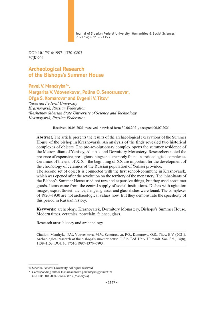 Библиографическое описание:Археологические исследования подворья Летнего дома архиерея = Archeological Research of the Bishops`s Summer House / П. В. Мандрыка, М. В. Вдовенкова, П. О. Сенотрусова [и др.]. - Текст : непосредственный // Журнал Сибирского федерального университета. Гуманитарные науки. - 2021. - Т. 14, № 8. - С. 1139-1153. - Библиогр.: с. 1152-1153. - ISSN 1997-1370.