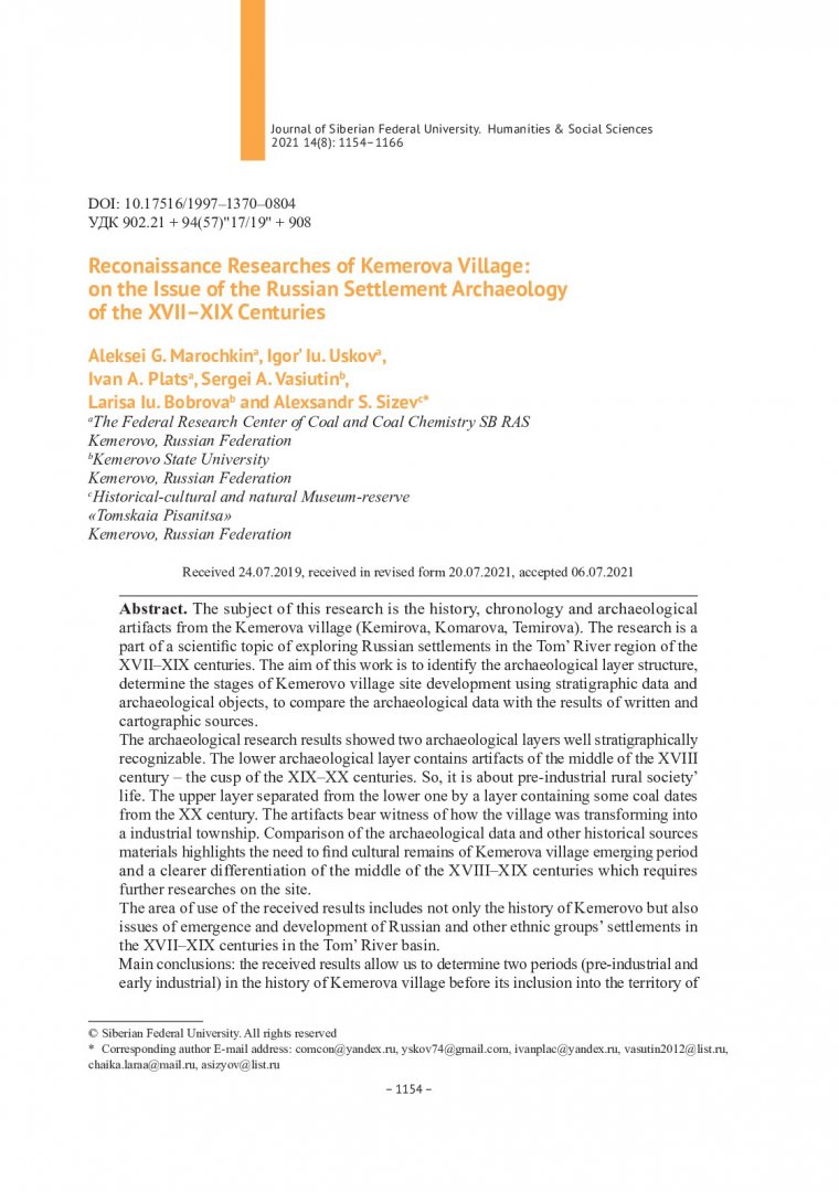 Библиографическое описание:Reconaissance Researches of Kemerova Village: on the Issue of the Russian Settlement Archaeology of the XVII–XIX Centuries = Рекогносцировочные исследования деревни Кемерово: к проблеме археологии русских сельских поселений XVII–XIX вв. / A. G. Marochkin, Igor’ Iu. Uskov, I. A. Plats [et al.]. - Текст : непосредственный // Журнал Сибирского федерального университета. Гуманитарные науки. - 2021. - Т. 14, № 8. - С. 1154-1166. - Библиогр.: с. 1164-1166. - ISSN 1997-1370.