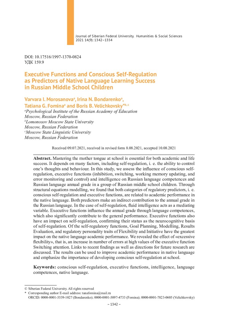 Библиографическое описание:Executive Functions and Сonscious Self-Regulation as Predictors of Native Language Learning Success in Russian Middle School Children = Исполнительные функции и осознанная саморегуляция как предикторы успешности обучения русскому языку в средней школе / V. I. Morosanova, I. N. Bondarenko, T. G. Fomina, B. B. Velichkovsky. - Текст : непосредственный // Журнал Сибирского федерального университета. Гуманитарные науки. - 2021. - Т. 14, № 9. - С. 1342-1354. - Библиогр.: с. 1351-1354. - ISSN 1997-1370.