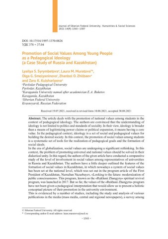 Библиографическое описание:Promotion of Social Values Among Young People as a Pedagogical Ideology (a Case Study of Russia and Kazakhstan) = Продвижение социальных ценностей в молодежной среде как педагогическая идеология (на примере России и Казахстана) / L. S. Syrymbetova, L. M. Muratova, O. G. Smolyaninova [et al.]. - Текст : непосредственный // Журнал Сибирского федерального университета. Гуманитарные науки. - 2021. - Т. 14, № 9. - С. 1365-1387. - Библиогр.: с. 1386-1387. - ISSN 1997-1370.
