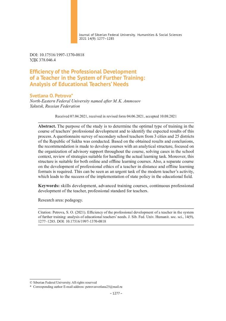Библиографическое описание:Petrova, Svetlana. Efficiency of the Professional Development of a Teacher in the System of Further Training: Analysis of Educational Teachers` Needs = Эффективность профессионального развития педагога в процессе повышения квалификации: анализ образовательных потребностей учителей / S. O. Petrova. - Текст : непосредственный // Журнал Сибирского федерального университета. Гуманитарные науки. - 2021. - Т. 14, № 9. - С. 1277-1285. - Библиогр.: с. 1285. - ISSN 1997-1370.