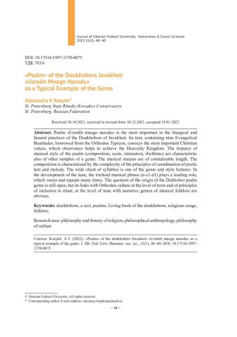 Библиографическое описание:Косых, А. В. "Псалом" духоборцев Джавахетии "Узрех много народу" как характерный пример жанра = "Psalm" of the Doukhobors Javakheti "Uzrekh Mnogo Narodu" as a Typical Example of the Genre / А. В. Косых. - Текст : непосредственный // Журнал Сибирского федерального университета. Гуманитарные науки. - 2022. - Т. 15, № 1. - С. 48-60. - Библиогр.: с. 57-60. - ISSN 1997-1370.