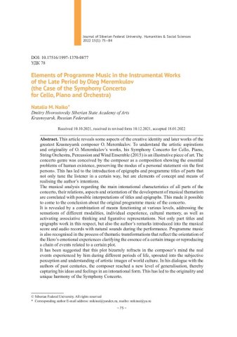 Библиографическое описание:Найко, Н. М. Элементы программности в инструментальных сочинениях позднего периода Олега Меремкулова (на примере Концерта-симфонии для виолончели, фортепиано и оркестра) = Elements of Programme Music in the Instrumental Works of the Late Period by Oleg Meremkulov (the Case of the Symphony Concerto for Cello, Piano and Orchestra) / Н. М. Найко. - Текст : непосредственный // Журнал Сибирского федерального университета. Гуманитарные науки. - 2022. - Т. 15, № 1. - С. 75-84. - Библиогр.: с. 83-84. - ISSN 1997-1370.