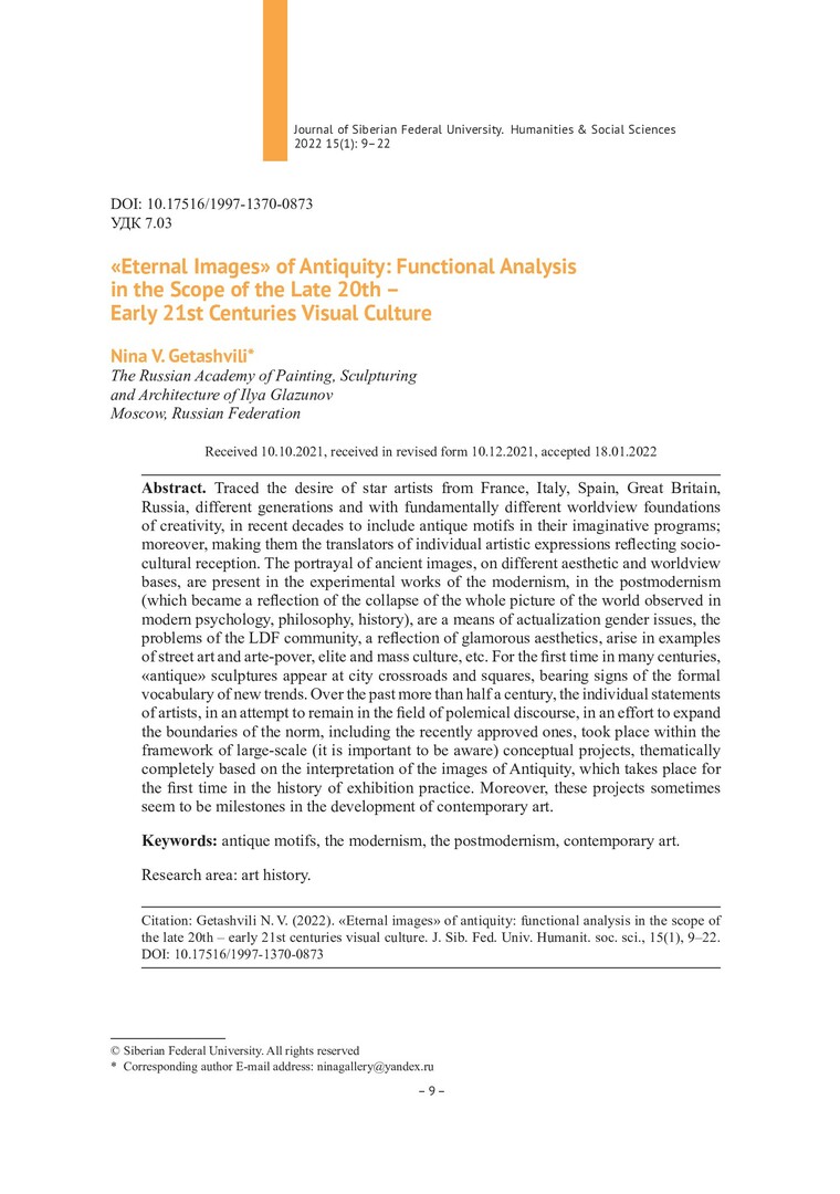 Библиографическое описание:Геташвили, Н. В. "Вечные образы" Античности и искусство второй половины XX – начала XXI века: опыт функционального анализа = "Eternal Images" of Antiquity: Functional Analysis in the Scope of the Late 20th – Early 21st Centuries Visual Culture / Н. В. Геташвили. - Текст : непосредственный // Журнал Сибирского федерального университета. Гуманитарные науки. - 2022. - Т. 15, № 1. - С. 9-22. - Библиогр.: с. 21-22. - ISSN 1997-1370.