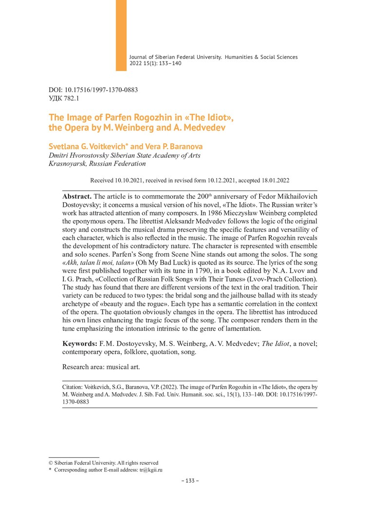Библиографическое описание:Войткевич, С. Г. Образ Парфена Рогожина в опере М. Вайнберга и А. Медведева "Идиот" = The Image of Parfen Rogozhin in "The Idiot", the Opera by M. Weinberg and A. Medvedev / С. Г. Войткевич, В. П. Баранова. - Текст : непосредственный // Журнал Сибирского федерального университета. Гуманитарные науки. - 2022. - Т. 15, № 1. - С. 133-140. - Библиогр.: с. 140. - ISSN 1997-1370.