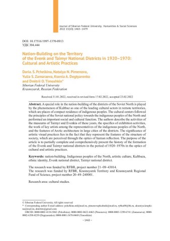 Библиографическое описание:Нациестроительство на территории Эвенкийского и Таймырского национальных округов в 1920–1970-е гг.: культурные и художественные практики = Nation-Building on the Territory of the Evenk and Taimyr National Districts in 1920–1970: Cultural and Artistic Practices / Д. С. Пчелкина, Н. Н. Пименова, Ю. С. Замараева [и др.]. - Текст : непосредственный // Журнал Сибирского федерального университета. Гуманитарные науки. - 2022. - Т. 15, № 10. - С. 1465-1479. - Библиогр.: с. 1477-1479. - ISSN 1997-1370.